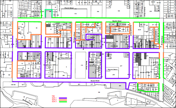 The higher sound limits (SCA1) follow central CBD streets where our entertainment venues are located, with an intermediary limit (SCA2) set for areas between venues and the edge of the Precinct and the lowest sound limit (SCA3) assigned to the residential interface.