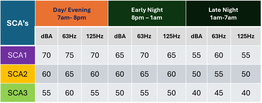 Three sound category areas (SCA1, SCA2 and SCA3) have been assigned to different parts of the Precinct which reflect different sound limits at different times of the day, evening and night.