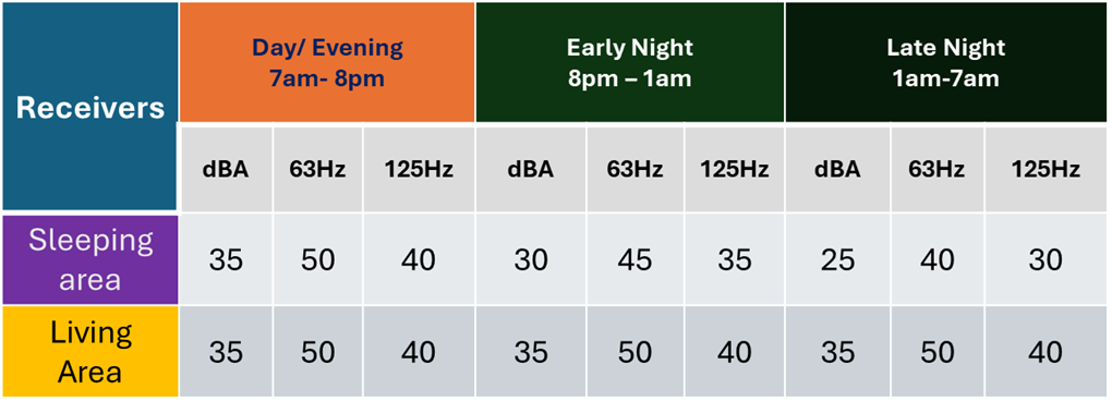 The applicable internal sound thresholds for sensitive receivers are presented below: