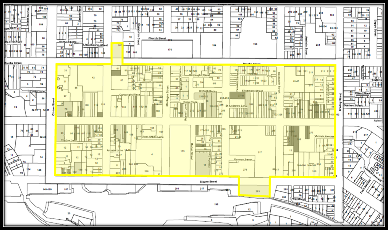 The Goulburn CBD Core which spans from Bradley Street to Clinton Street, Sloane Street to Bourke Street and includes the Goulburn Bowling Club and the Hume Conservatorium. A map of the Goulburn CBD Special Entertainment Precinct is presented in the Precinct Management Plan, Development Control Plan Policy and in the figure below: