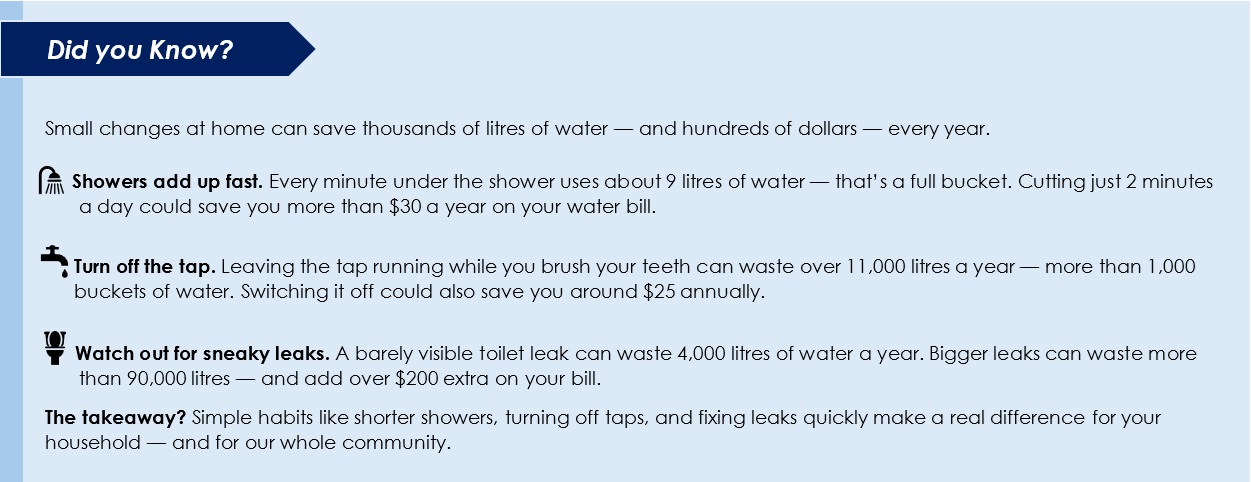 This campaign is designed to engage residents - especially newcomers to our region - in adopting positive water practices before drought restrictions may need to be introduced. By promoting smart, sustainable behaviours now, Council can strengthen the community's preparedness and reduce the future burden on water systems and emergency water services.